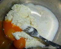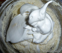 Apoi, albusele de ou se bat spuma ca la bezea, adaugand restul de zahar. Cand compozitia de albus ajunge sa nu cada din vasul in care se afla, daca este intors invers, se adauga in 2 sau 3 etape in compozitia de branza, amestecand usor, sa ramana pufoasa. Succesul de asta depinde.