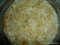 Se pregateste un vas de circa 24-26 cm diametru, se unge cu o pensula cu ulei si se tapeteaza cu pesmetul. Se adauga spuma de branza si se presoara zaharul brun pe deasupra cat mai uniform, apoi se pun fulgii de migdale.