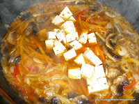 Acum este momentul sa adaugam cubuletele de tofu si mai lasam circa 1 minut sa fiarba, la foc mediu spre mic.