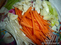 Nu va speriati ca sunt multe ingrediente, se face iute totul. Doar sa pregatiti ingredientele. Morcovul se taie betisoare subtiri, lungi de vreo 7-8 cm, la fel si prazul. Partea alba de la ceapa verde se toaca si usturoiul se feliaza subtire.