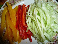 Ardeiul rosu si galben se taie fasii subtiri si lungi de 7-8 cm. Varza se desface fin si se toaca la fel, fasii lungi.