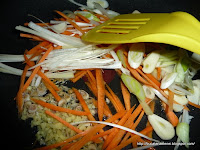 Deci, punem in wokul incins uleiul de arahide. Peste el punem lemongrass, ghimbir, usturoi, morcov, praz si partea alba de la ceapa.