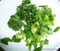 Cozile verzi de teapa se toaca marunt. Dupa cum se vede, eu mai aveam vreo trei fire de patrunjel si le-am pus si pe ele, sa nu se strice.