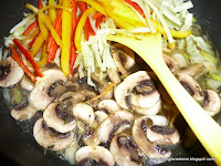 Dupa 30 de secunde de amestecare usoara si infierbantare, adaugam ciupercile, supa, ardeiul si varza.