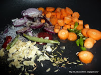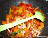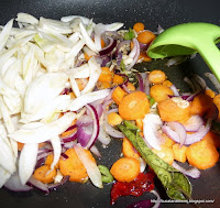 Ceapa se taie rondele subtiri, usturoiul se zdrobeste, morcovul curatat se taie feliute cam de grosimea bobului de naut. Se pun in tigaie adanca sau un alt vas legumele, cu uleiul, semintele de fenicul, ardeiul iute rosu si cel verde tocat, sare si piper, frunzele de curry.