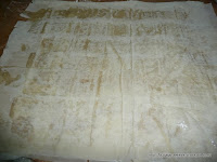 Se mai aseaza o foaie, care se unge cu ulei si inca una. Nu se scalda in ulei! Se intinde un sfert din compozitia de branza pe 2/3 din suprafata foilor.
