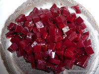Separat se curata (cu manusi!) sfecla si se toaca mici cubulete. Daca a fost fiarta, se lasa la scurs in sita.