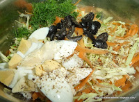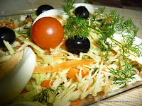 Intr-un vas se pune varza, morcovul, maslinele feliate pe lung, mararul tocat si 1 ou si jumatate taiat rondele fine. Se pune piper dupa gust. Uleiul de masline, sarea si zeama de limette se bate bine cu furculita si se toarna peste legume.