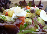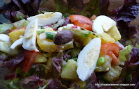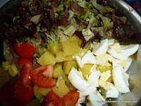 Am pus in castron, peste legumele cu masline, cartofii, salata rupta si rosia taiata felii. Am oprit cateva feliute de rosie pentru decor. Am pus si 3/4 din oul fiert tocat cuburi. Cand faceti pentru dieta, renuntati la ou.