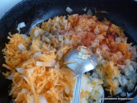 Ceapa se toaca marunt, se amesteca putin cu 1/2 lingurita de sare; se rade morcovul pe razatoarea cu ochiuri mari; se pune morcovul cu ceapa si 2 linguri ulei intr-un vas la inabusit. Se adauga piper si boia dulce amestecata cu iute, daca va place mai condimentat.