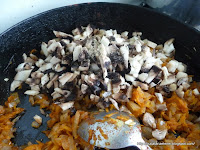 Se amesteca la foc mic spre mediu pana se inmoaie putin amestecul. Se adauga ciupercile curatate si tocate marunt.
