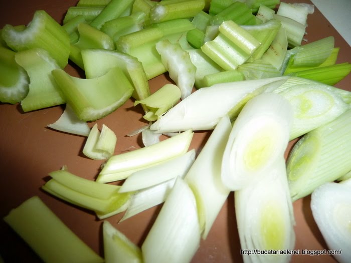 Partea alba de la ceapa si prazul se taie rondele in diagonala, dar grosier. Firele de telina se taie cuburi de aceeasi dimensiune cu ceapa si prazul.