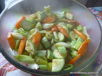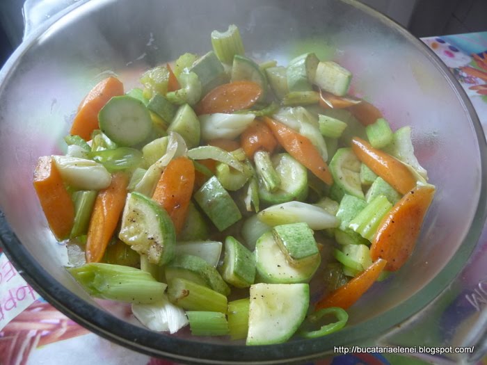 Dupa 3-4 minute, nu mai mult, se scot legumele si se pun intr-un vas pentru cuptor.