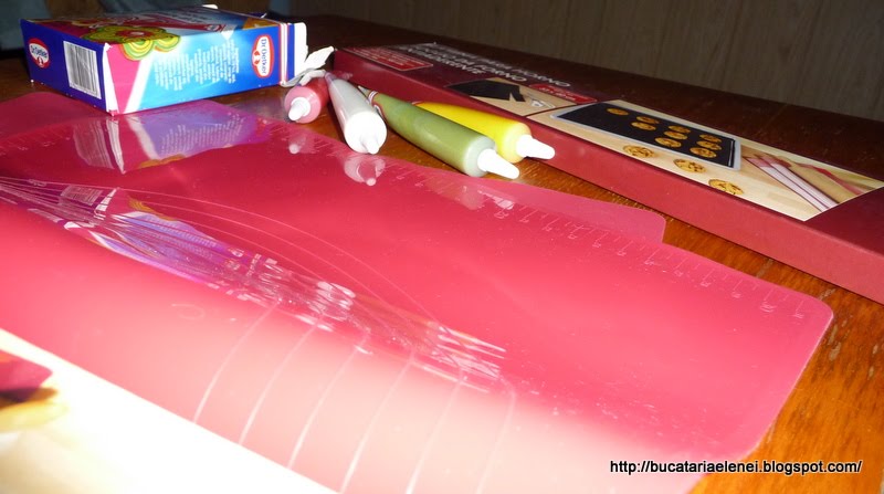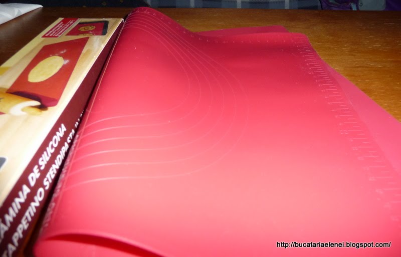 Aici este o "foaie" de silicon, care suporta si coacere, dar este foarte "desteapta", are marcaje pentru blaturi circulare de diferite dimensiuni si marcaje pe laturi, ca o rigla.