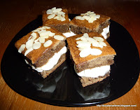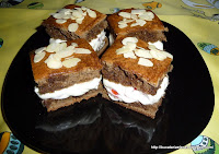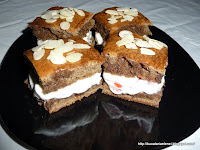 Am continuat asa cu toate bucatile. La sfarsit am pus marginile taiate in cubulete mai mici pe o farfurioara de desert, am turnat siropul ramas si am lasat asa cateva minute, iar apoi am pus toata frisca ramasa. Deasupra am presarat fulgi de migdale. Asta ca sa recuperam totul, sa nu se piarda nimic. Dar, pentru voi doar astea: