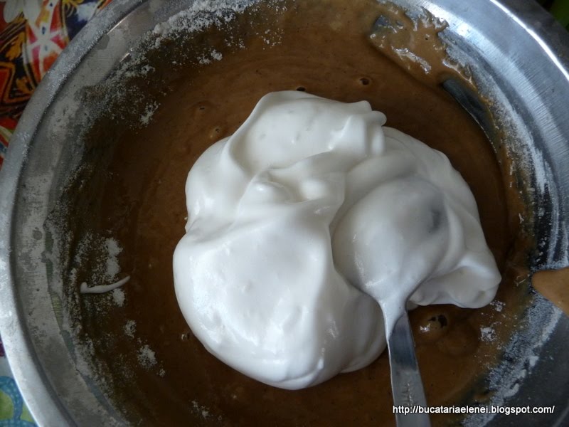 Separat am amestecat praful de copt cu faina si am adaugat in compozitie, amestecand mereu. La sfarsit, am adaugat albusele batute spuma, ca pentru bezea, cu restul de zahar pudra.