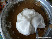Am amestecat usor, cu lingura (am uitat de paleta!) bezeaua; am turnat compozitia intr-o tava acoperita cu hartie de copt umezita si stoarsa, ca sa se intinda bine in colturi.