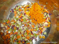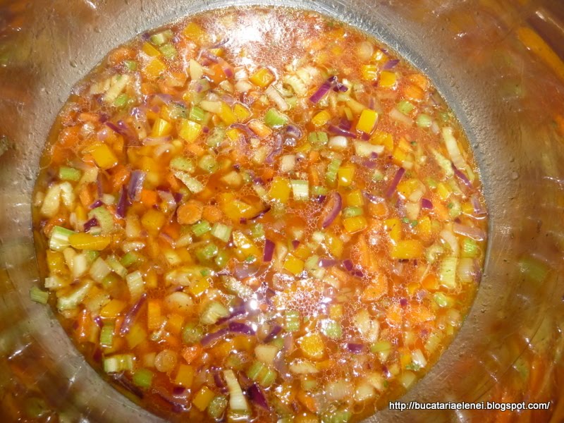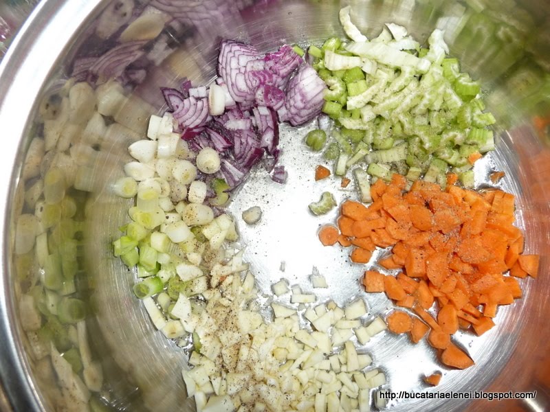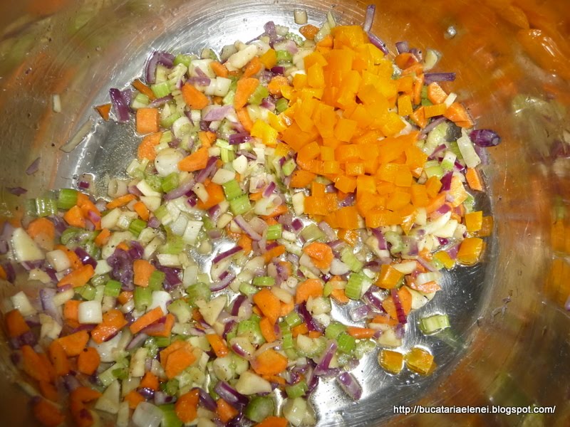 Se toaca radacinoasele (pastarnac, morcov), tijele de telina, ceapa rosie si partea alba de la ceapa verde in cubulete mici. Se pun intr-o cratita cu fund gros si capac, ca sa poate fierbe la foc mic, uleiul si legumele, sare si piper proaspat macinat.