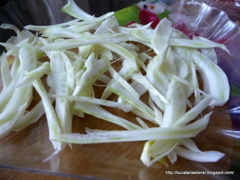 Gulia se curata de coaja si se taie fasii subtiri, tot cu dispozitivul amintit, adaugandu-se peste celelalte legume.