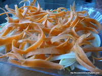 Se curata, spala si se feliaza subtire, cu dispozitivul de curatat legume, morcovul. Se pun fasiile obtinute peste fenicul.