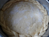 Din aluatul de cozonac se face o foaie, care sa acopere fundul tavii. Din bucatele de aluat, rulate, se obtin suluri subtiri care se impletesc, formand o "coroana", pe marginea tavii.