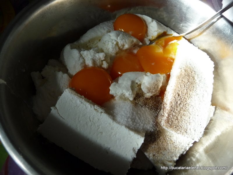 Se pun branza, urda, sarea, vanilia, galbenusurile de la 4 oua si grisul intr-un vas.