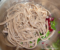 Se lasa pastele sa stea 3-4 minute in lichid si dupa aceea se scurg. Asa fierbinti se pun peste legumele din castron.