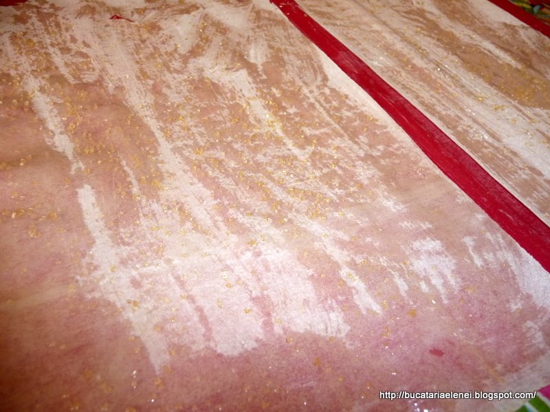 Se acopera cu a doua foaie, se unge cu ulei si se presoara zahar, iar apoi a treia . Sau se poate face cu foile intregi si sa se taie in jumatate dupa suprapunere. Eu le-am taiate inainte pentru ca mi-a fost teama ca se vor rupe la taiere. Fiecare fasie se pune jumatate in tava unsa cu ulei si jumatate afara, una langa alta sa formeze un fel de evantai. Se procedeaza la fel si cu alte 3 foi, acestea fiind suficiente ca sa acopere suprafata tavii.
