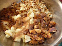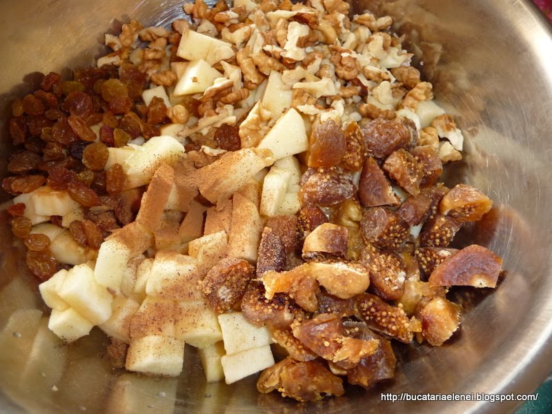 Se pun intr-un vas merele, smochinele, stafidele, scortisoara si nucsoara, nucile tocate grosier, mierea si pesmetul.