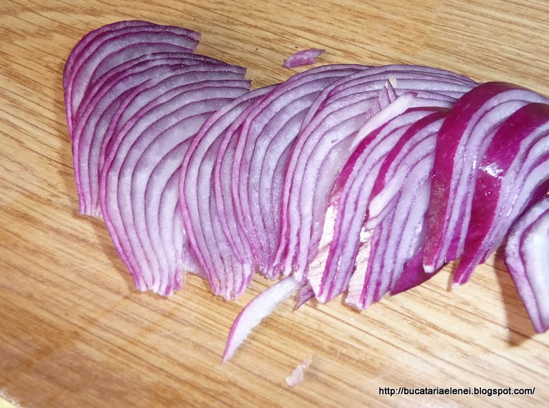 Tocati miejii felii grosiere, scuturand din cojitele uscate. Tocati ceapa feliute subtiri si amestecati-o cu putina sare, apoi puneti-o intr-un vas incapator.