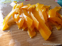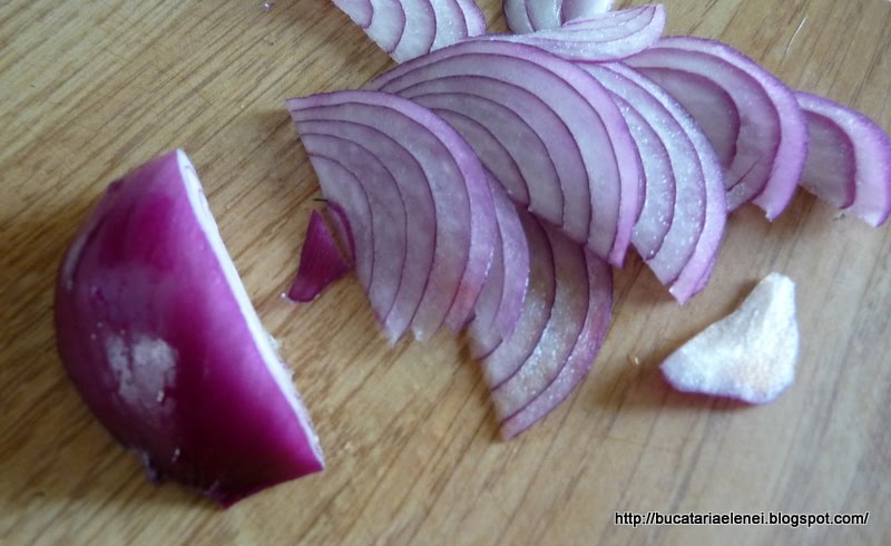 Se taie ceapa rosie rondele subtiri, in diagonala un pic.