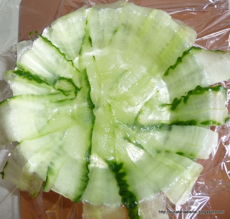 Taiati cu dispozitivul de curata legume fasii subtiri de castravete si le puneti pe o farfurie presarate cu putina sare.
