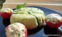 Am dat formele la frigider pentru cel putin o ora. Apoi am scos din forme continutul invelit, am desfacut usor folia si am pus pe farfurie. Cum mi-a ramas putina compozitie, am umplut 3 jumatati de rosii cherry cu ea.