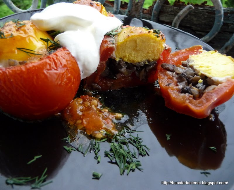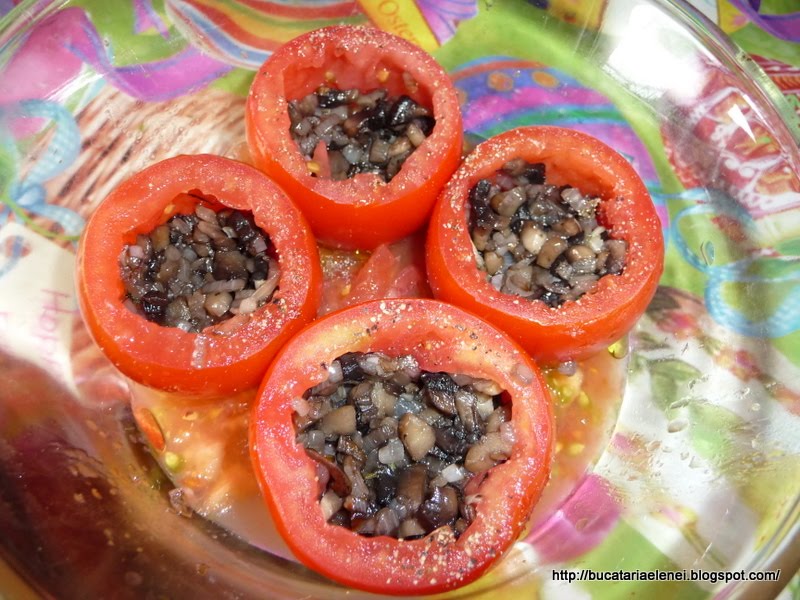 Puneti intr-un vas lingura de ulei ramas, sosul, capacelele de rosii cu gura in sus. In fiecare rosie punem ciuperci inabusite pana la jumatate, presate putin.