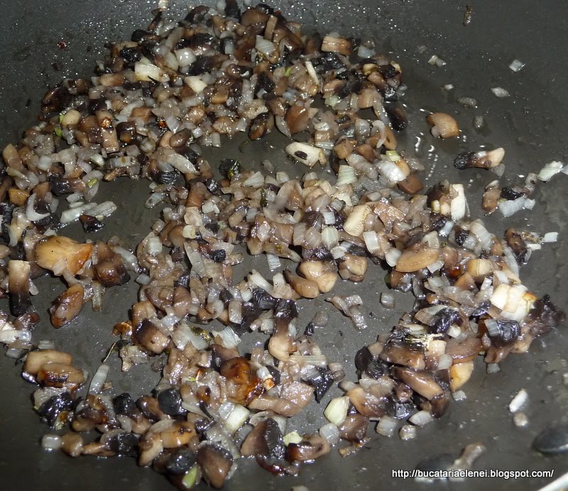 Tocati ciupercutele curatate marunt. La fel si ceapa. Puneti intr-o tigaie 1 lingura de ulei, ceapa, ciupercile, sare si cimbrisor.