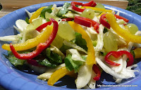 Se pun in vas, peste fenicul, macrisul, ardeii grasi si iute, boabele de strugure taiate jumatati, sare, piper, uleiul si zeama de lamaie. Se amesteca usor si se lasa 2-3 minute si e gata de consumat. Macrisul se comporta foarte bine si nu se inmoaie de la dressingul salatei, din cauza principiilor acide pe care le contine.
