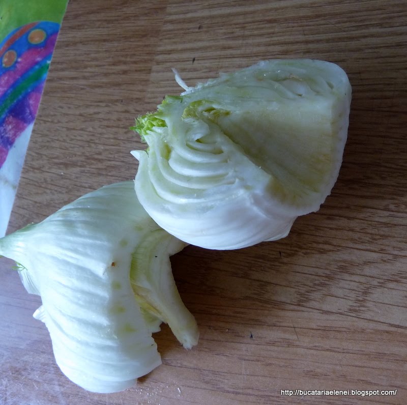 Dupa cum v-am mai spus, se curata si se spala bulbul de fenicul, se taie in jumatate si se scoate cotorul. Se feliaza subtire si se pune intr-un vas.