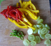 Se taie rondele ardeiul iute, iar cei grasi se taie fasii subtiri. Boabele de strugure spalate se taie jumatati.