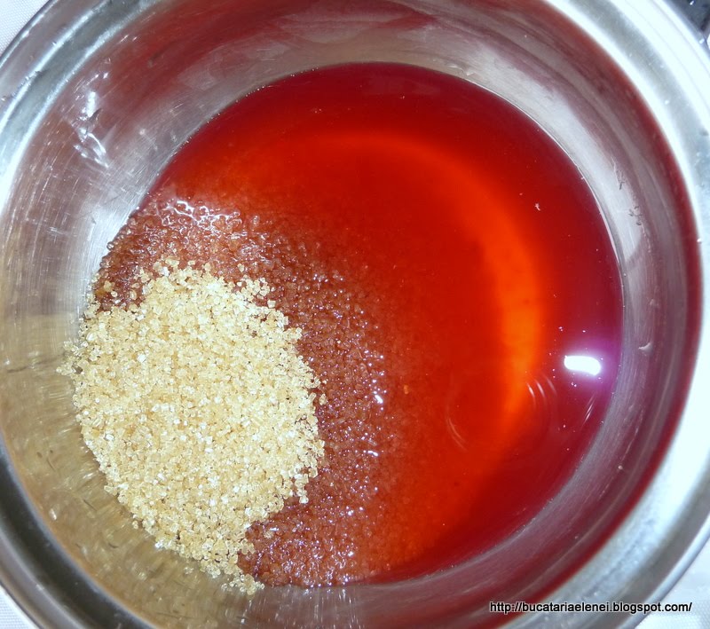 Am dizolvat zaharul in otet si sucul de portocale si am turnat peste ceapa.