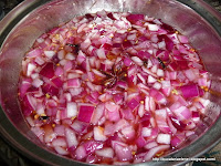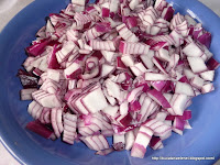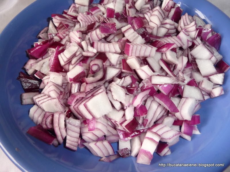 Deci, am curatat si tocat ceapa, cubulete, dar nu marunt . Chestie de gust, daca vreti sa iasa ca un gem, tocati ca sa vedeti cubuletele cu lupa!