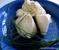 Nu sariti cu gura pe mine, ca nu e cine stie ce reteta! Nici n-am spus ca am redescoperit roata. Va propun o combinatie la care puteti controla usor grasimile, si sarea, folosind branzeturi nesarate. Deci aici aveti branzeturile si chives, presarate cu putina sare si piper.