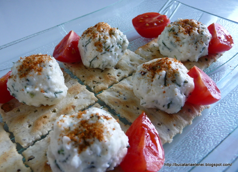 Punem, mai artistic sau mai putin, fiecare dupa talent, cate o lingurita sau doua de amestec branzos peste biscuiti si decorati cu rosii cherry taiate jumatati sau sferturi. Ca o mica smecherie, am pus si putina boia iute deasupra.