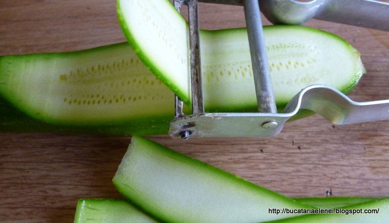 Dovleceii spalati ii vom felia, cu dispozitivul economic de curatat legume, o parte din felii le vom pastra pentru o salata (a carei reteta va veni si ea intr-un post separat), iar ce ramane, inclusiv cotoarele fragede le vom toca fie cubulete, fie betisoare, sau aiurea, cum va place, dar nu foarte mici.