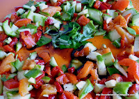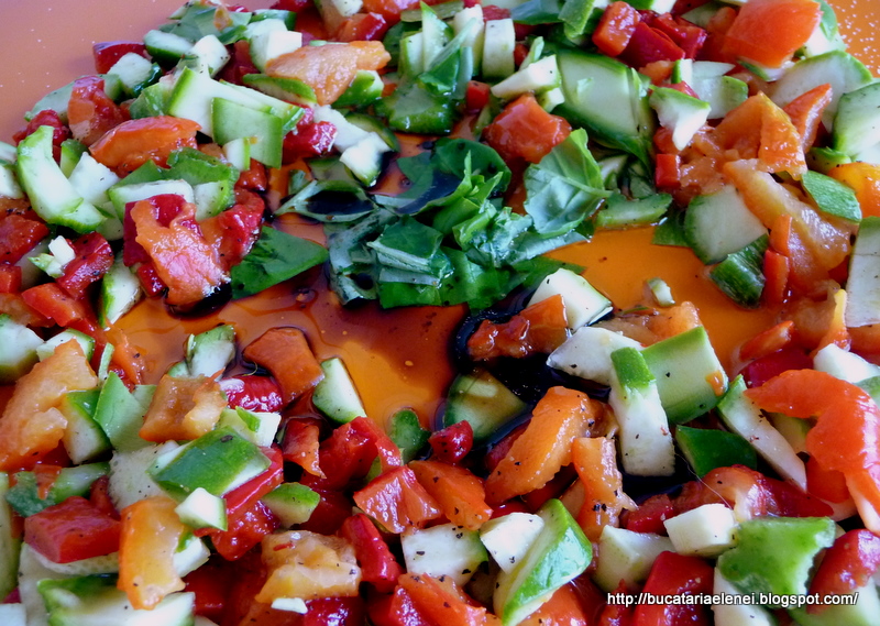 Vom adauga la dovlecei, pe o planseta destul de mare, pe care se vor amesteca ingredientele salatei, ardeii copti rupti fasii, sare si piper