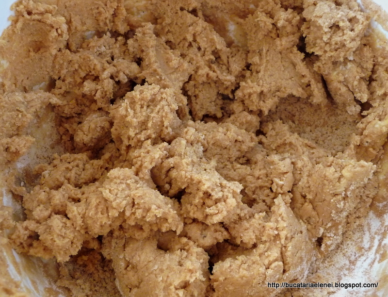 Se strange in folie transparenta si se pune la congelator pentru 25 de minute cel putin. Se fac bilute, manevrand cat mai putin, pentru a nu se incalzi, se dau prin zahar brun si se pun in tava (cu gratar) cu hartie de copt, in cuptor preincalzit (200 grade) pentru 15 minute. Nu mai mult!
