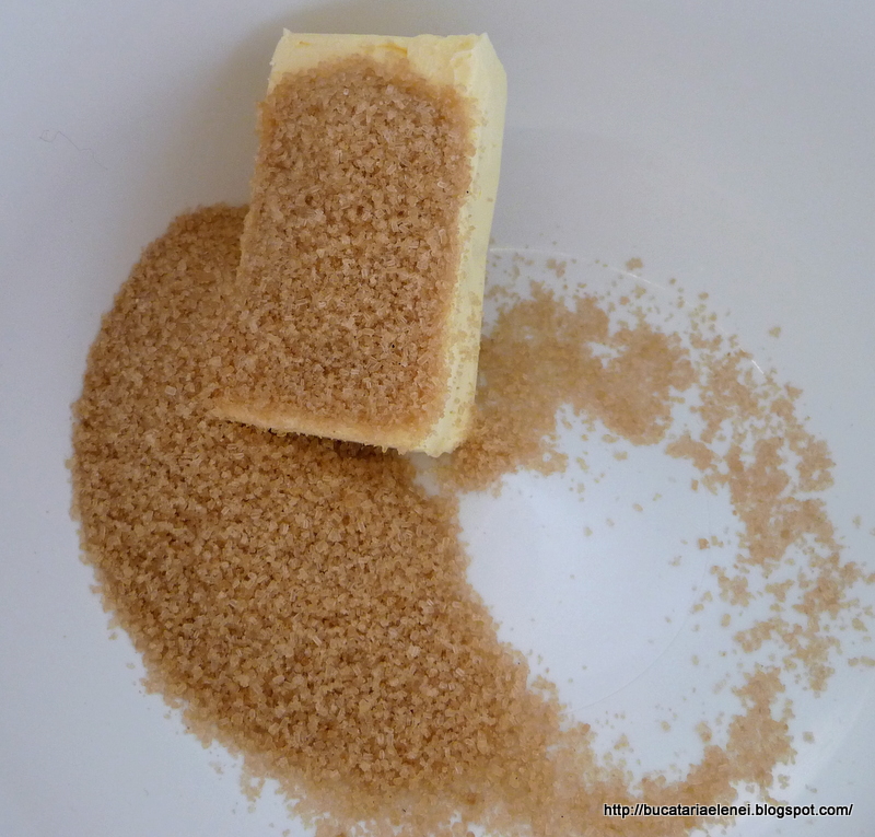Zaharul brun peste unt in mixer, la transformat in crema (ma rog, era cam rece untul, dar nu prea are mare importanta)