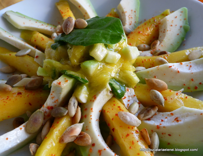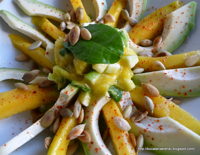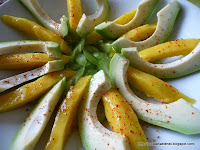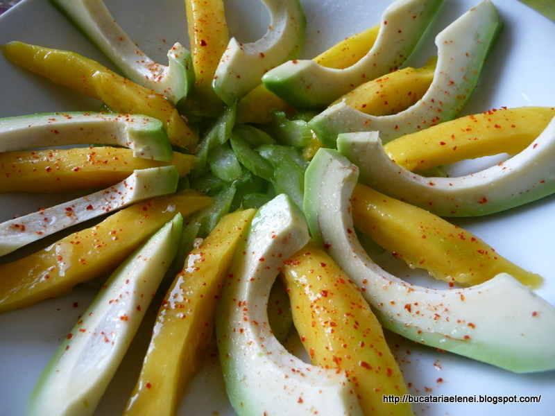 Mango curatat, taiat felii lungi si avocado felii lungi. Presarat sare, fulgi de chili si stropi cu zeama de limette.