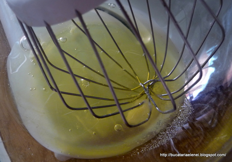 Separat am pus albusurile si sarea mixand sa se transforme in bezea. Am adaugat restul de 110 g zahar, cate putin ca bezeaua sa capete consistenta.