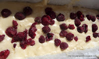 Se pune jumatate de compozitie in tava cu hartie de copt (umezita si sifonata, ca sa se aseze bine in tava). Se adauga zmeura, presarand uniform, chiar daca unele mai au tendinta sa se scufunde.