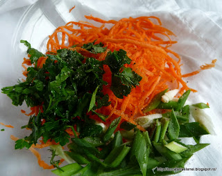 Eh, daca m-am racorit, sa va spun ce am mai facut. Am taiat morcovii cu un dispozitiv de razuit fasii subtiri de lamaie, ca mi s-a parut interesant sa arate asa. Am taiat ceapa verde in rondele si marunt patrunjelul.